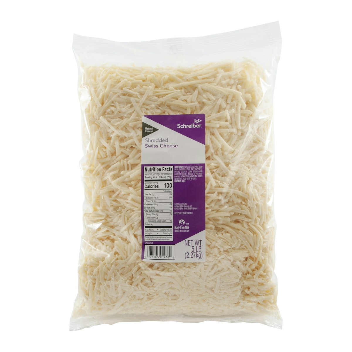 SWISS CHEESE (PART-SKIM MILK, CHEESE CULTURE, SALT, ENZYMES), POTATO STARCH, CORN STARCH AND CALCIUM SULFATE ADDED TO PREVENT CAKING, NATAMYCIN (A NATURAL MOLD INHIBITOR), ENZYMES. AGED OVER 60 DAYS. CONTAINS: MILK