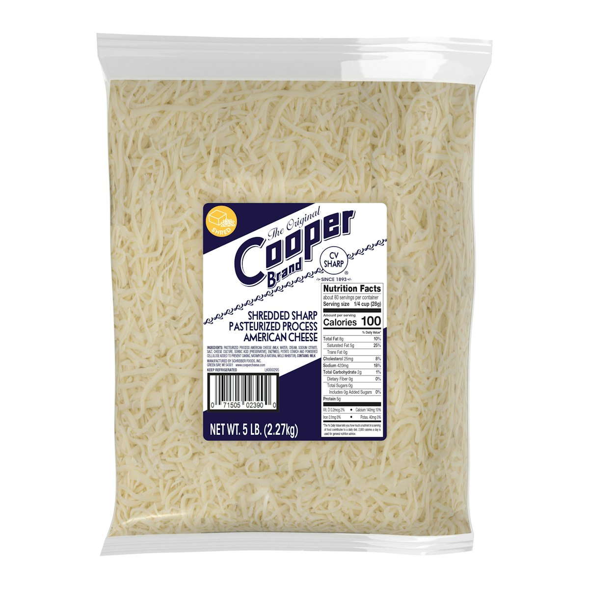The original, the champ. Cooper® Sharp White American is now in a bulk shredded format for easy and delicious ingredient and restaurant applications. Made with milk and cut as a feather shred, it melts like a dream. Our branded case contains four 5-lb bags of shredded cheese. For additional information, please visit www.coopercheese.com.